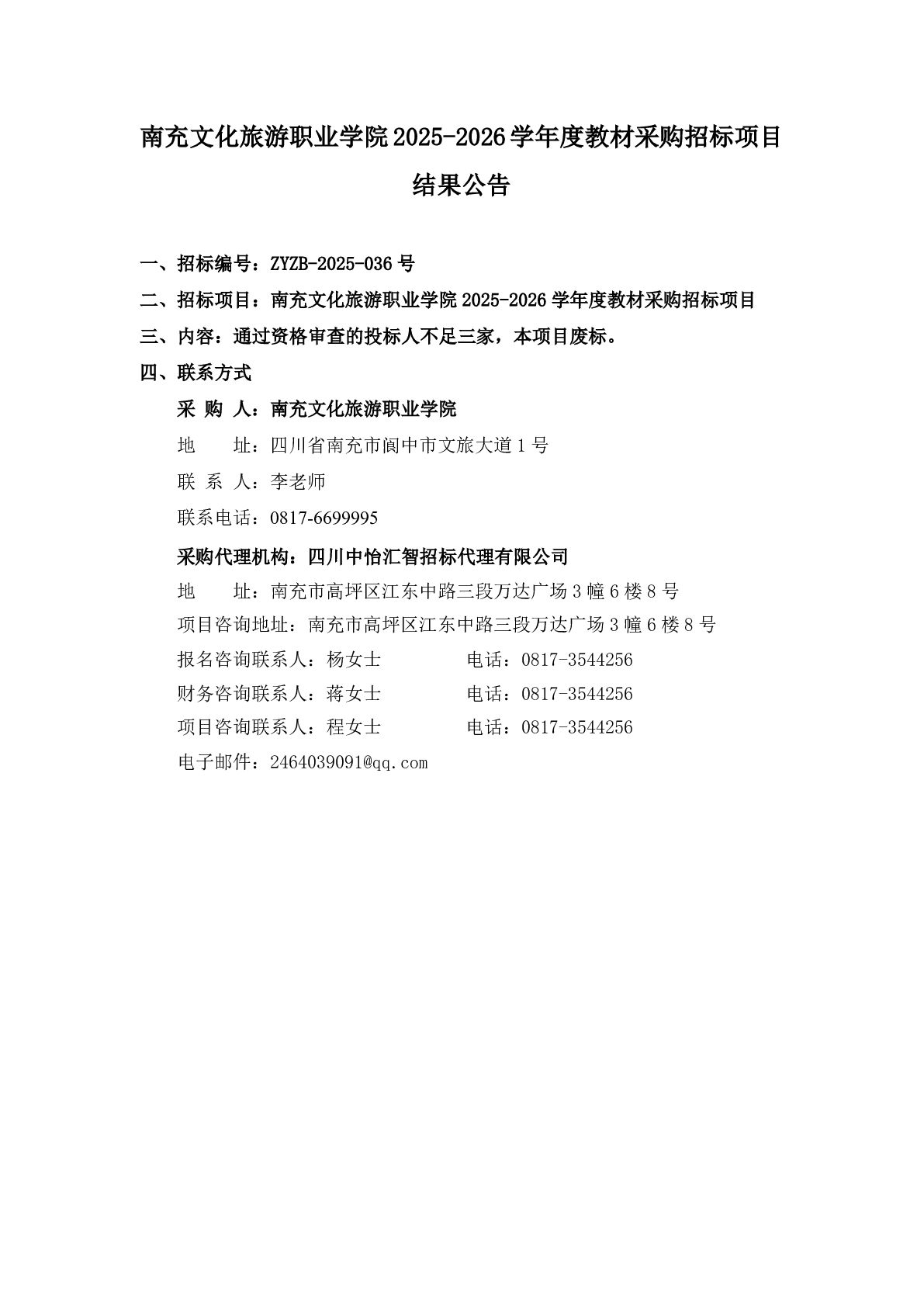 南充文化旅游职业学院2025-2026学年度教材采购招标项目结果公告