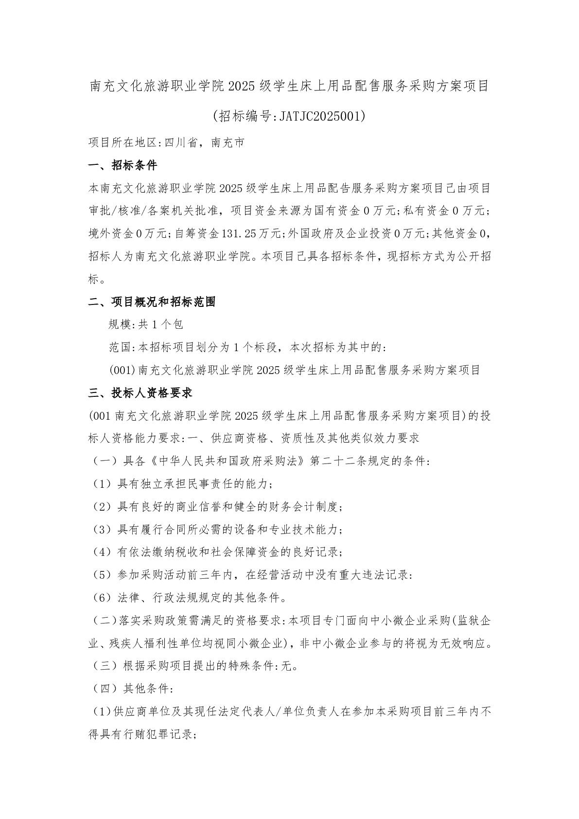 南充文化旅游职业学院 2025 级学生床上用品配售服务采购方案项目