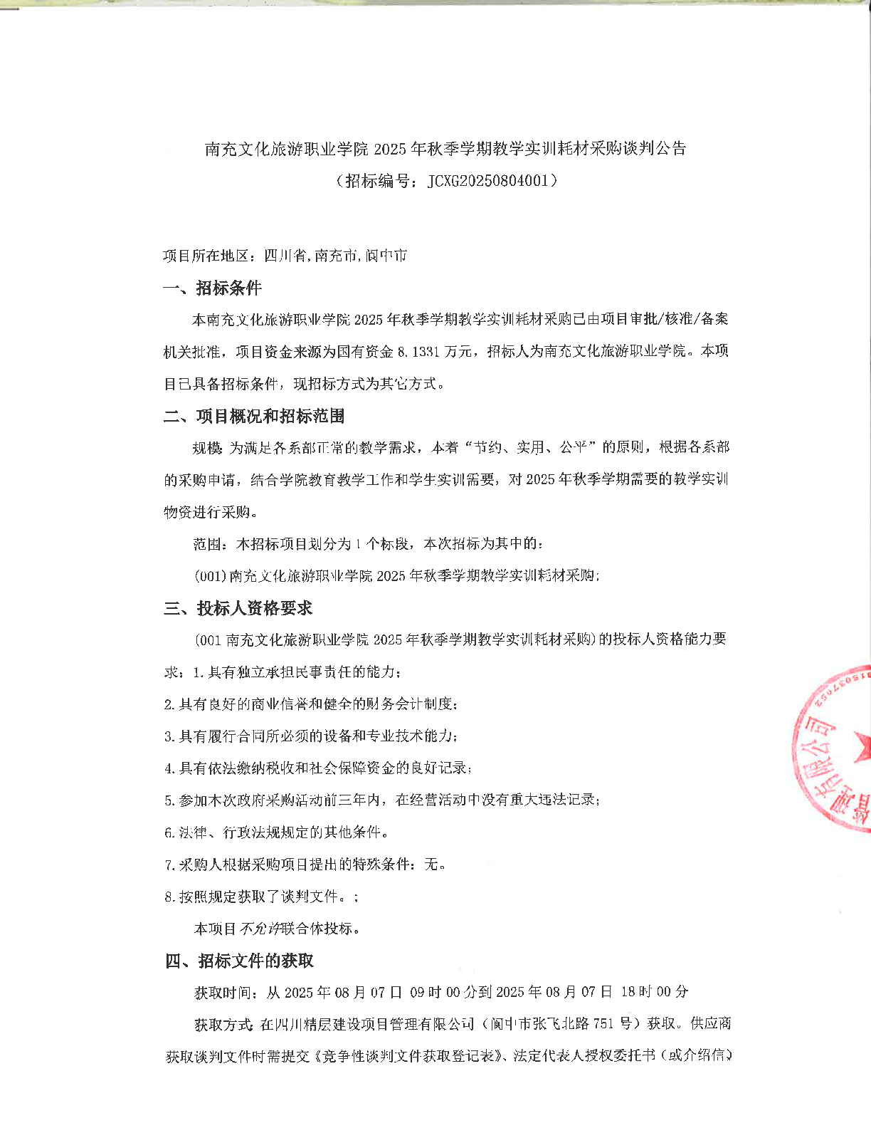 南充文化旅游职业学院2025年秋季学期教学实训耗材采购谈判公告.pdf