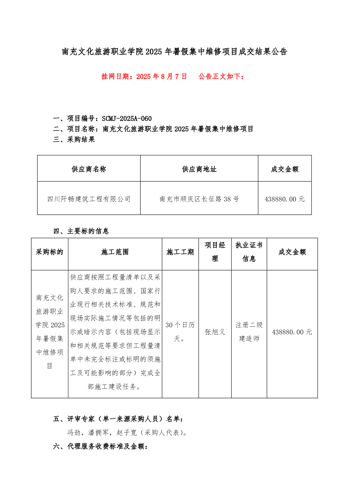 南充文化旅游职业学院2025年暑假集中维修项目成交结果公告